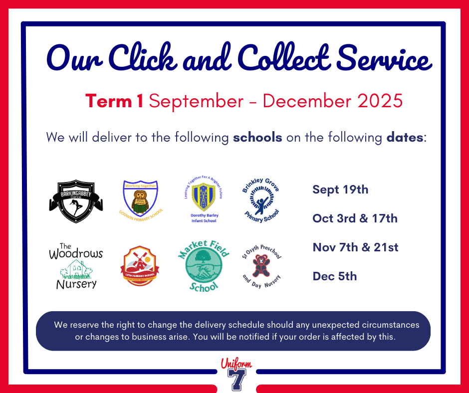 For a detailed breakdown of the schools participating in our Click and Collect service and the delivery dates, please refer to the accompanying image.