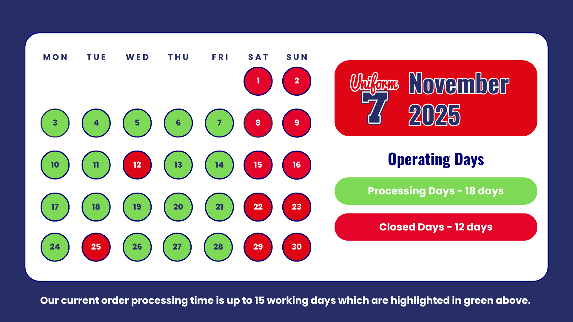 Our processing time is up to 15 working days for made to order goods but can be quicker for official school collections. This may be longer during busy periods e.g. back to school season.